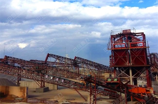 大块花岗岩由振动给料机均匀地送到粉碎机进行粉碎,粉碎后的石料被输送到振动筛进行筛分,达到成品粒度要求的被输送至成品料堆,不符合要求的石料经输送机返回至粉碎机重新加工,直至粒度合格。由于花岗岩硬度较高,要配置两台以上的粉碎机才能完成粉碎流程。